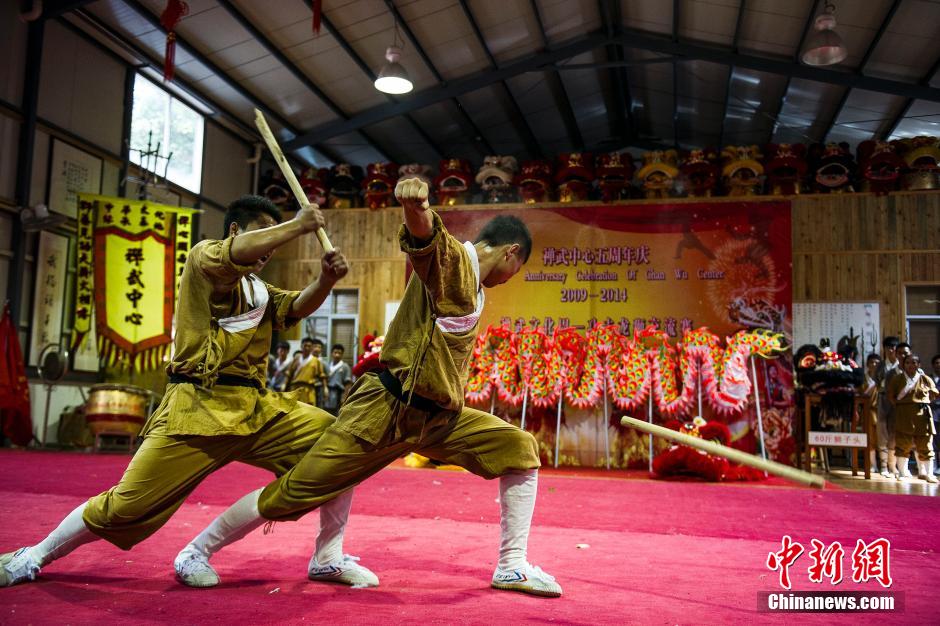 7月17日,广东禅武中心,师傅们拿手绝技引来现场观众的阵阵掌声。当日,广东禅武中心五周年庆暨“禅武文化周”开幕式在广东禅武文化馆举行,文化周期间将陆续举办传统龙狮、功夫交流赛、书画展及南粤古风音乐会等系列主题活动。广东禅武文化中心于2009年挂牌成立,5年间共开设中华传统文化学习班19 期,为海外华社培养770多名优秀的功夫和狮艺人才。中新社发 龙宇阳 摄