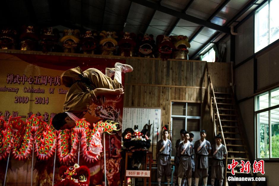 7月17日,广东禅武中心,师傅们拿手绝技引来现场观众的阵阵掌声。当日,广东禅武中心五周年庆暨“禅武文化周”开幕式在广东禅武文化馆举行,文化周期间将陆续举办传统龙狮、功夫交流赛、书画展及南粤古风音乐会等系列主题活动。广东禅武文化中心于2009年挂牌成立,5年间共开设中华传统文化学习班19 期,为海外华社培养770多名优秀的功夫和狮艺人才。中新社发 龙宇阳 摄