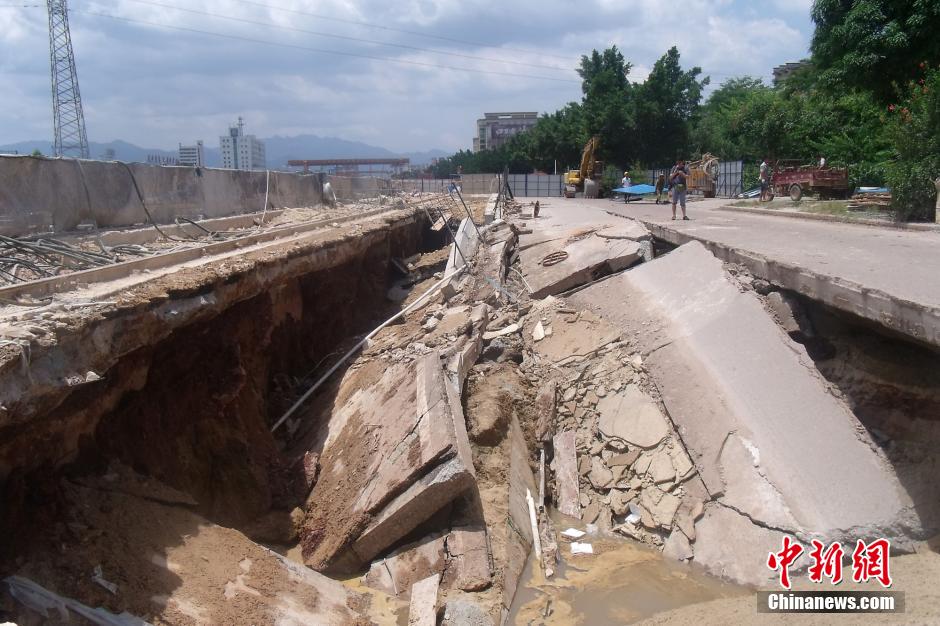 7月17日早上9时50分许,莞惠城轨惠州大道往火车北站方向一在建路段出现塌方(东风村与乌石村段)。塌方路段长约30米,深度有约4米。塌方事故造成该路段全线中断。事故没有造成人员伤亡。中新社发 严初 摄