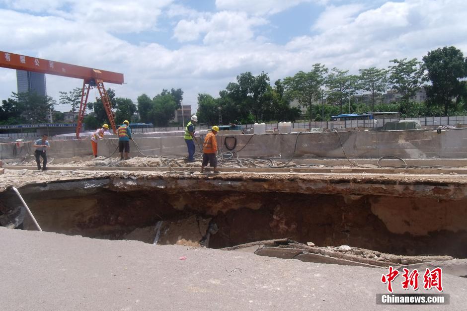 7月17日早上9时50分许,莞惠城轨惠州大道往火车北站方向一在建路段出现塌方(东风村与乌石村段)。塌方路段长约30米,深度有约4米。塌方事故造成该路段全线中断。事故没有造成人员伤亡。中新社发 严初 摄