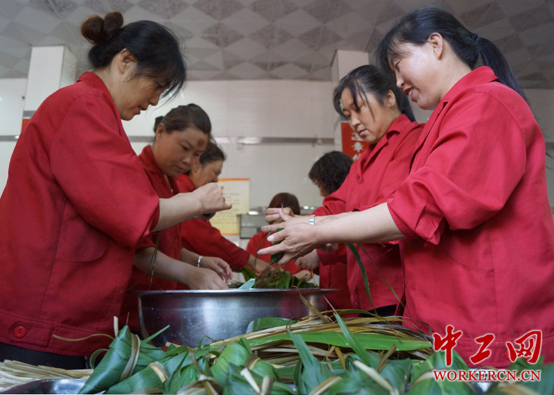 端午节前夕,矿嫂们开始包粽子,和大家一起过节。(中工网记者杨灵 摄)