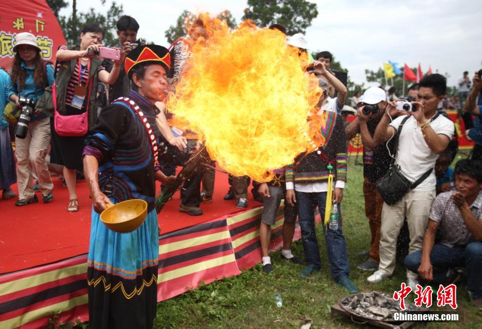 7月20日,在四川省凉山市安哈镇举行的彝族火把节上,彝族祭司毕摩为民众表演口舔烧红的铧铁,嘴喷火团,灵巫苏尼则击鼓跳舞,为各民族大众祈求幸福。中新社发 徐崇德 摄