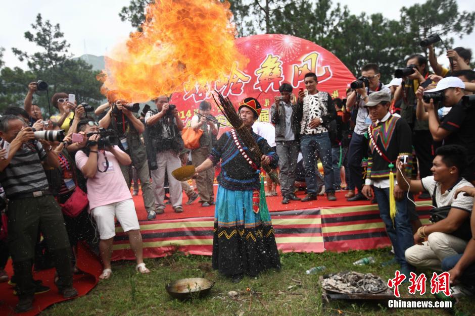 7月20日,在四川省凉山市安哈镇举行的彝族火把节上,彝族祭司毕摩为民众表演口舔烧红的铧铁,嘴喷火团,灵巫苏尼则击鼓跳舞,为各民族大众祈求幸福。中新社发 徐崇德 摄