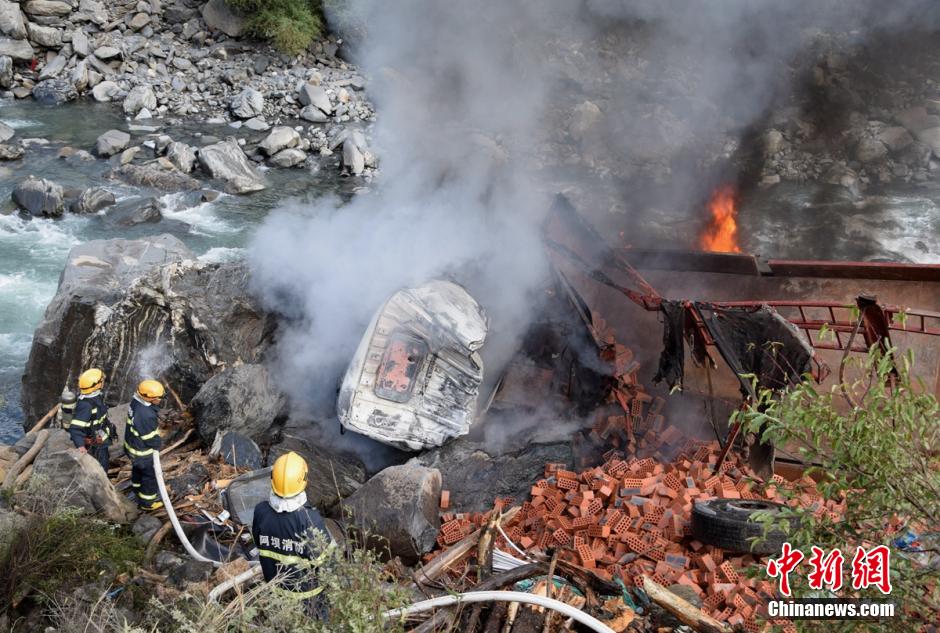 7月20日上午,省道302线途经四川黑水县铁别村境内路段发生一起交通事故,一满载建材的货车侧翻坠崖,导致车辆油箱泄漏起火燃烧,幸未造成人员伤亡。钟欣 摄