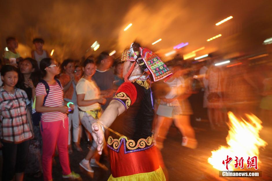 7月20日晚,在四川省西昌市,彞族人民欢聚一起,高举火把,围着篝火,跳起欢乐的达体舞,载歌载舞,欢庆彞族火把节。中新社发 徐崇德 摄