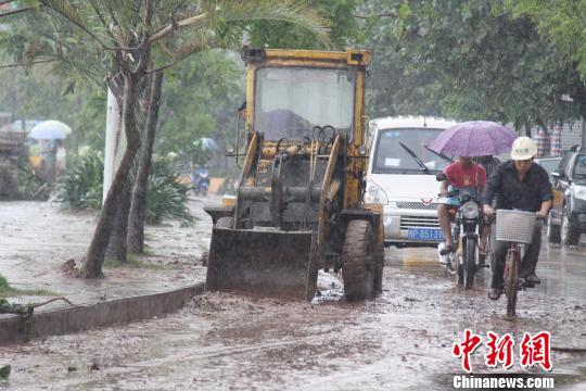 环卫部门使用机械铲除被洪水淹过的河堤。 陈义才 摄