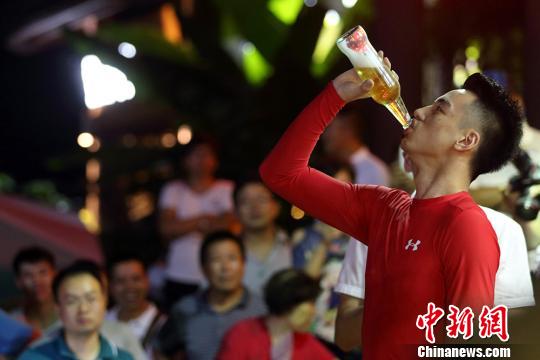 参赛市民参与喝啤酒比赛。 泱波 摄