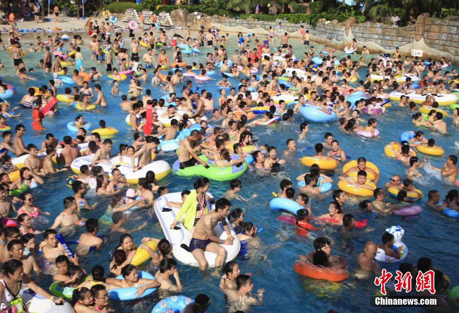 7月21日,重庆市多个区县气温紧随“入伏”脚步,冲上37℃。同时,重庆市气象台预计未来几天,主城将进入连续晴热高温模式。图为重庆南山加勒比海水世界,数千市民聚集在人工冲浪池,享受清凉片刻。周毅 摄