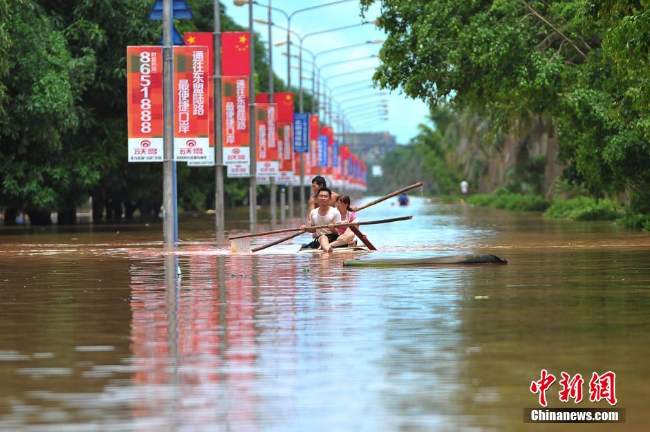 7月21日,受“威马逊”残留云系的影响,广西降雨持续,导致部分河流水位上涨,超出警戒水位。流经崇左市宁明县的明江洪水暴涨,将县城、乡镇低洼地带淹没。广西壮族自治区防汛抗旱指挥部自7月20日11时起启动自治区洪涝灾害IV级应急响应。图为被淹没的宁明县城街道。洪坚鹏 摄