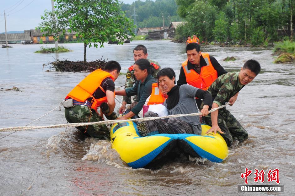 7月21日,受大范围降雨天气影响,黑龙江省伊春市多处地区水位上涨,部分低洼地带出现内涝,消防官兵经3小时救援,成功救援22名被困民众,并将其转移至安全地带。中新社发 张君峰 摄