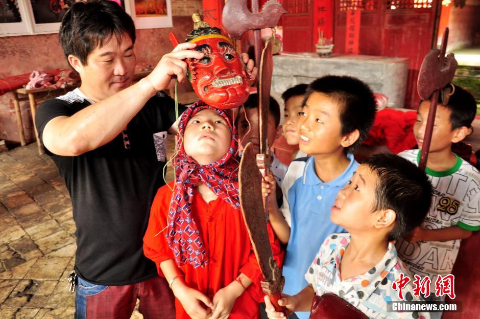 7月22日,江西省万载县潭埠镇第15代傩舞传承人丁红斌正在为留守儿童传授傩舞技艺。暑期里,江西省万载县潭埠镇组织该镇留守儿童学习国家级非物质文化遗产--万载傩舞,并指定傩舞传承人将傩舞技艺手把手教给孩子们,让孩子们了解非物质文化遗产,丰富暑期生活。邓龙华摄
