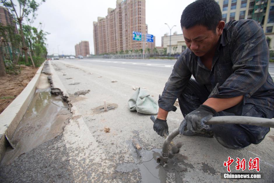7月22日,施工人员正在灌注混凝土砂浆。当日,山西太原北中环街附近发现机动车道最右边机动车道内,密密麻麻地插着数百根白色细管。道路施工方表示,这些管子是用来灌注混凝土砂浆的,目的是解决地基沉降问题。中新社发 张云 摄