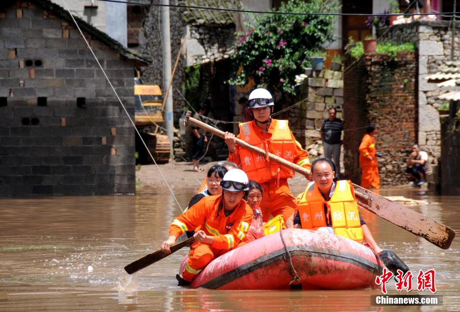 7月22日,贵州省兴义市威舍镇阿依村二龙口组整个村寨被强降雨引发的洪水围困,变成“孤岛”,洪水一度淹过村子低洼处的民房房顶,部分猪、牛等大型牲畜被洪水卷走,全村36户260余人连夜紧急撤离至地势较高地带,出行受阻。图为消防员利用皮划艇疏散民众。中新社发 覃苗苗 摄