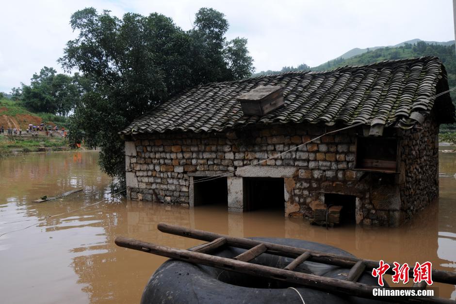 7月22日,贵州省兴义市威舍镇阿依村二龙口组整个村寨被强降雨引发的洪水围困,变成“孤岛”,洪水一度淹过村子低洼处的民房房顶,部分猪、牛等大型牲畜被洪水卷走,全村36户260余人连夜紧急撤离至地势较高地带,出行受阻。中新社发 覃苗苗 摄