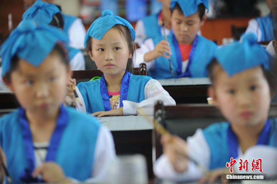 7月22日,小朋友在公益书法课堂上学习书法。当日,安徽合肥市芙蓉社区暑期公益书法课堂开课。社区聘请书法老师义务为辖区小朋友免费进行书法培训,丰富孩子们的暑期生活。中新社发 张娅子 摄