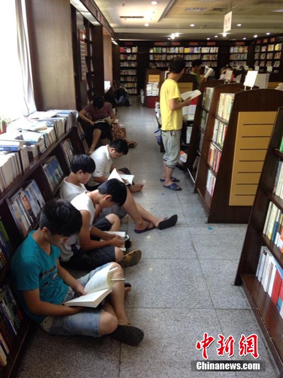 7月22日中午,浙江金华江南的新华书店,众多市民在此看书纳凉。虽然书店配有椅子,但早已座无虚席,很多人索性直接坐到了地上或者书柜上。中新社发 李婷婷 摄