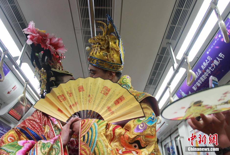 西安地铁2号线开通“七夕爱情专列”,在车厢内有七夕文化标语,运行时间为7月22日至8月7日,“唐明皇”与“杨贵妃”搭乘首列”七夕爱情专列”,穿越千年时空。马智峰 摄