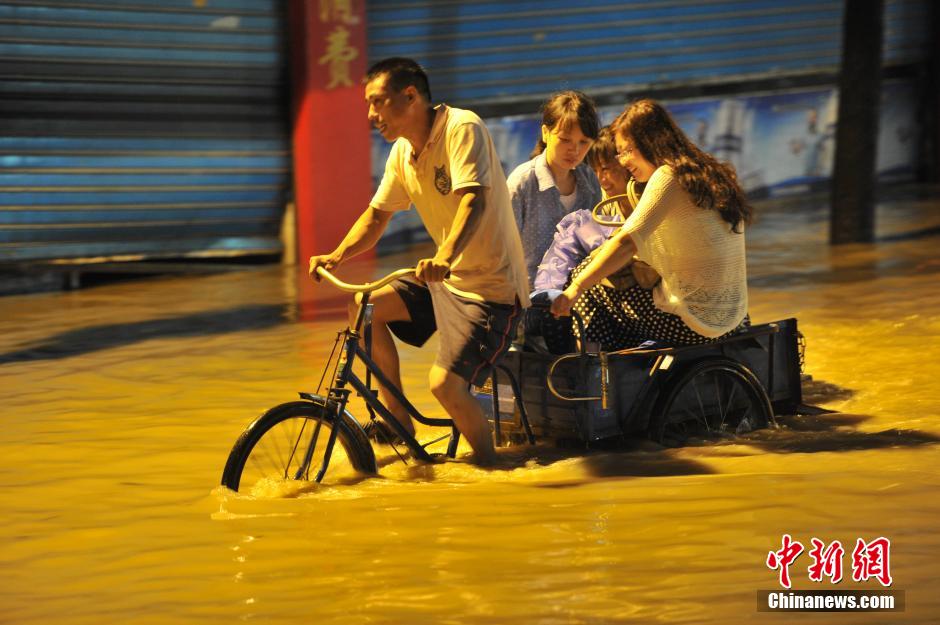 7月23日,今年第10号台风“麦德姆”穿越台湾海峡后,于当日15时30分许在福建福清登陆。“麦德姆”给福建沿海地区带来狂风暴雨,许多广告牌,福州市区多处路段积水成灾。图为民众艰难出行。 中新社发 吕明 摄