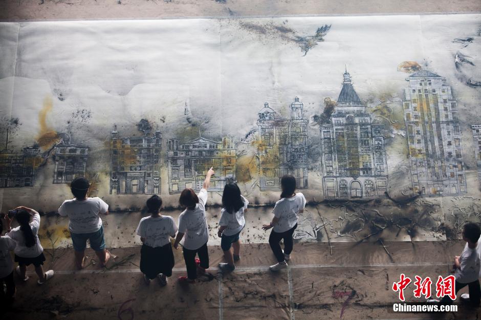 7月24日,在上海当代艺术博物馆内,蔡国强用火药为笔墨,现场爆破完成了名为《没有我们的外滩》的火药草图。作品全长27米、高4米,展现了一幅人迹杳然的外滩幻象。中新社发 张亨伟 摄