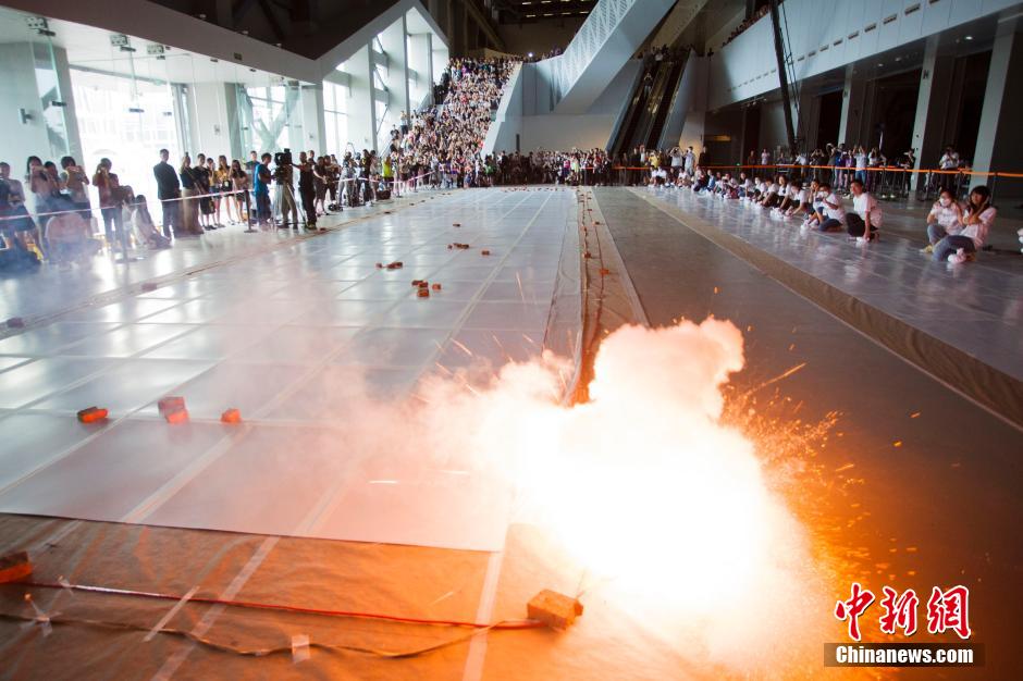 7月24日,在上海当代艺术博物馆内,蔡国强用火药为笔墨,现场爆破完成了名为《没有我们的外滩》的火药草图。作品全长27米、高4米,展现了一幅人迹杳然的外滩幻象。中新社发 张亨伟 摄