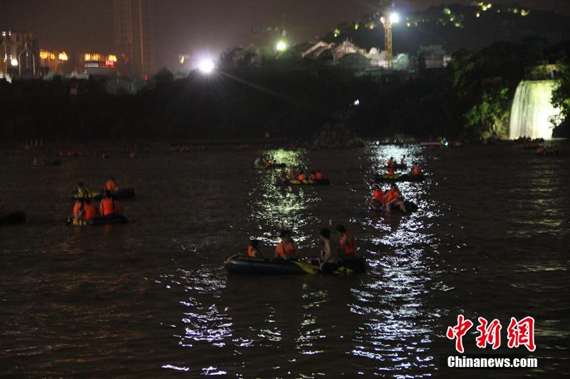 广西市民柳江河划皮艇夜游 如“下饺子”