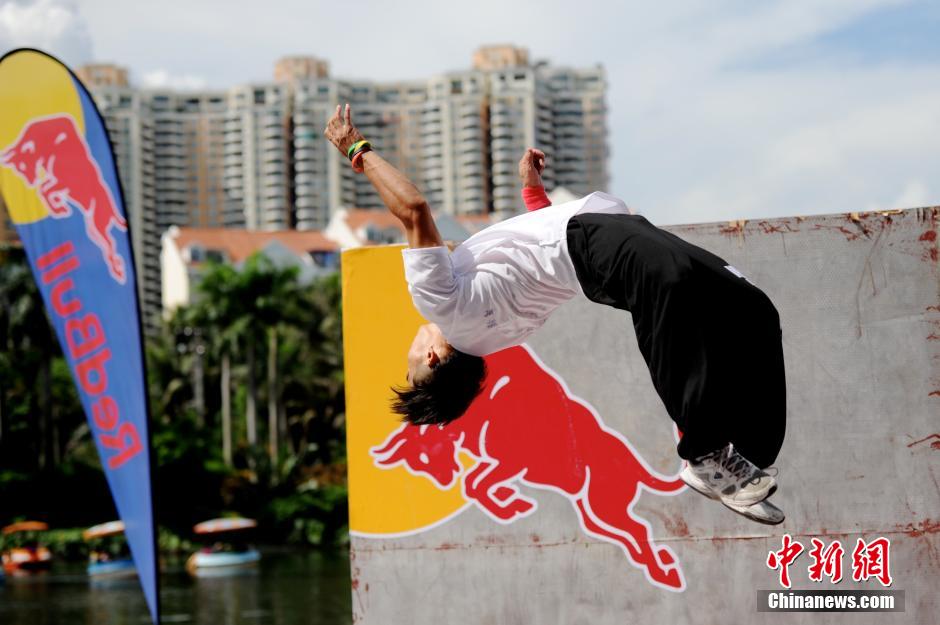 7月27日,2014红牛跑酷大赛深圳站比赛在欢乐谷举行,评分规则更注重原创性、流畅性、动作风格和表现力,无规定路线,无“规定动作”,展现跑酷运动的自由精神和艺术气质。从5月开始一直到10月,将会在重庆、宁波、深圳、南宁、长沙、乌鲁木齐、北京7个城市设置分站赛赛区。中新社发 陈文 摄
