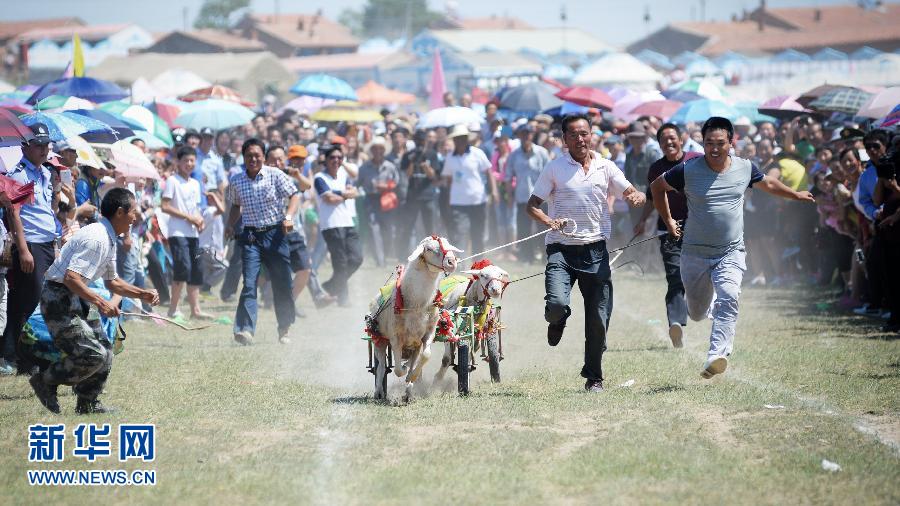 7月27日拍摄的羊拉车赛决赛。当日,中国尚义第十一届赛羊会在河北省张家口市尚义县石井乡四台蒙古营村圆满闭幕。据了解,尚义赛羊会已经成功举办了十届,是当地群众喜爱的独具特色的“羊奥运”,成为当地一种特色文化活动。本次活动共举办赛羊、赛马两大项比赛。新华社发(张笑宇摄)
