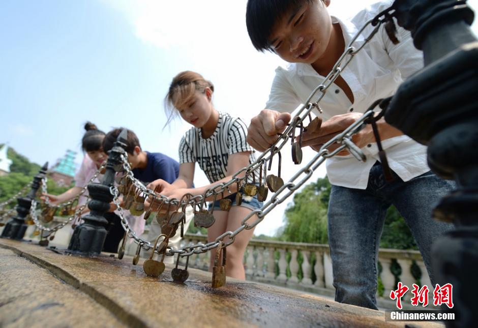 8月1日,正值七夕节前夕,湖南长沙世界之窗内的几对情侣在许愿池边挂起了同心锁,期盼他们的爱情永恒不变。 中新社记者 杨华峰 摄