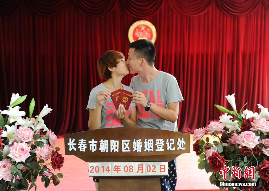 8月2日,长春一对情侣在长春朝阳区婚姻登记处登记结婚。当日为阴历七月初七中国情人节,虽然是星期六,但很多新人希望能在这一天领到结婚证,为此,长春民政各区婚姻登记处都加班为新人办理业务。中新社发 张瑶 摄