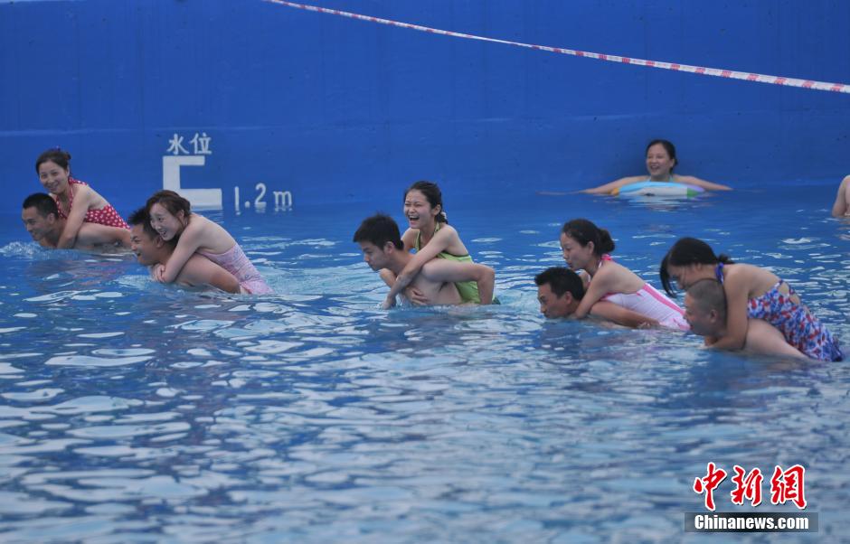 8月2日是七夕情人节。1日晚,重庆涪陵红酒小镇水上乐园背“媳妇”、画红唇等比赛项目吸引众多重庆情侣玩水上大战迎七夕。陈超 摄