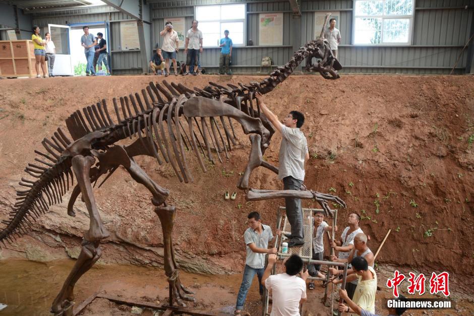 图为两具按照棘鼻青岛龙同比例制作的恐龙模型在山东莱阳组装完成。