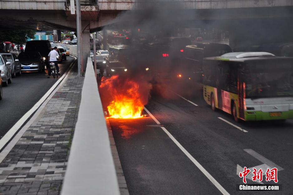 8月4日下午17时45分许,北京,记者在莲花桥下遇到一起汽车自燃事件,车辆从冒烟到起火仅短短4、5分钟。10分钟后,交警赶到现场疏导交通,随后消防车赶到现场扑灭大火。 中新网记者 陈海峰 摄