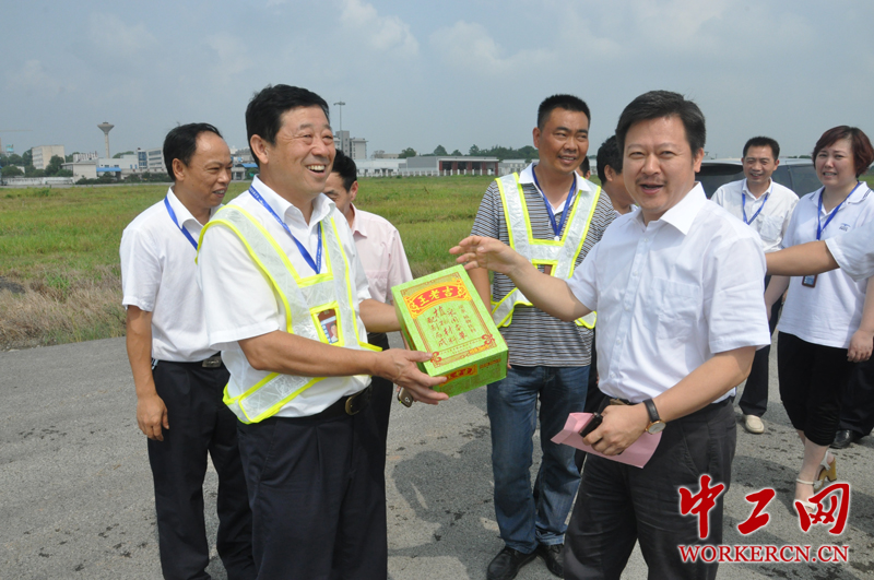 刘志仁总经理酷暑下慰问机坪施工人员,为大家送去解暑饮品,并叮嘱“一定要注意安全”。 中工网记者 韩靖 摄