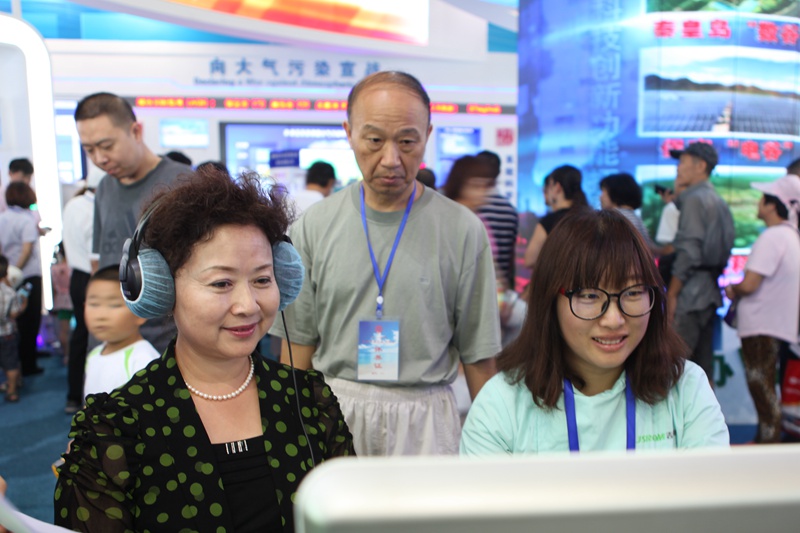 8月9日上午,在北戴河休养的劳模们来到秦皇岛市奥体中心体育馆参观全国科技创新成果展。节能环保产品、新能源汽车和节能建筑材料都是本次展览的亮点,引起了劳模的广泛关注。许多人围在无线充电汽车、终端水处理装置、节能型智慧城市路灯系统等高精尖产品前,仔细观看产品性能特点,一边听工作人员讲解,一边向参展商询问有关技术问题。图为展览现场,劳模在体验疾病与健康风险侦测系统。中工网记者 范治林 摄