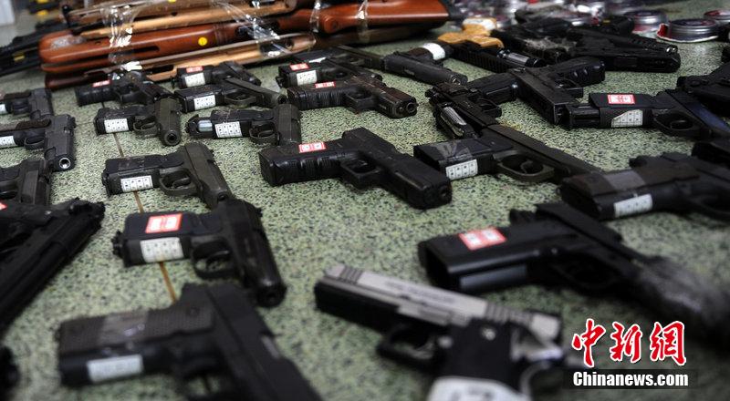 2014年8月11日,沈阳,警方正在整理收缴的仿真枪。王齐波 摄 图片来源:CFP视觉中国