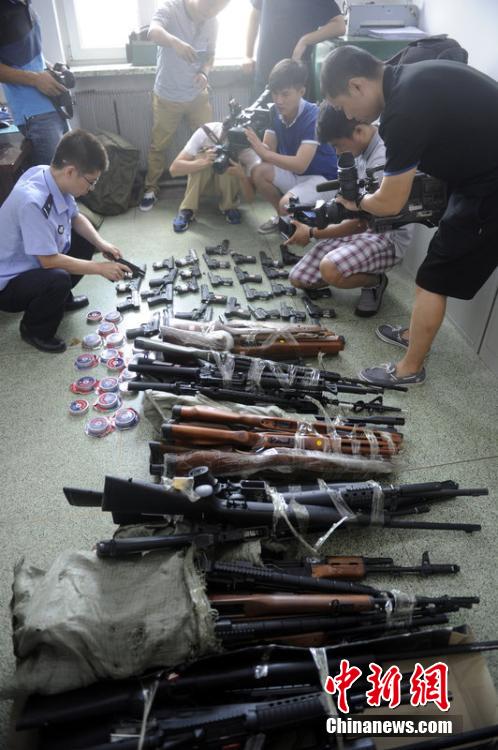 2014年8月11日,沈阳,警方正在整理收缴的仿真枪。王齐波 摄 图片来源:CFP视觉中国