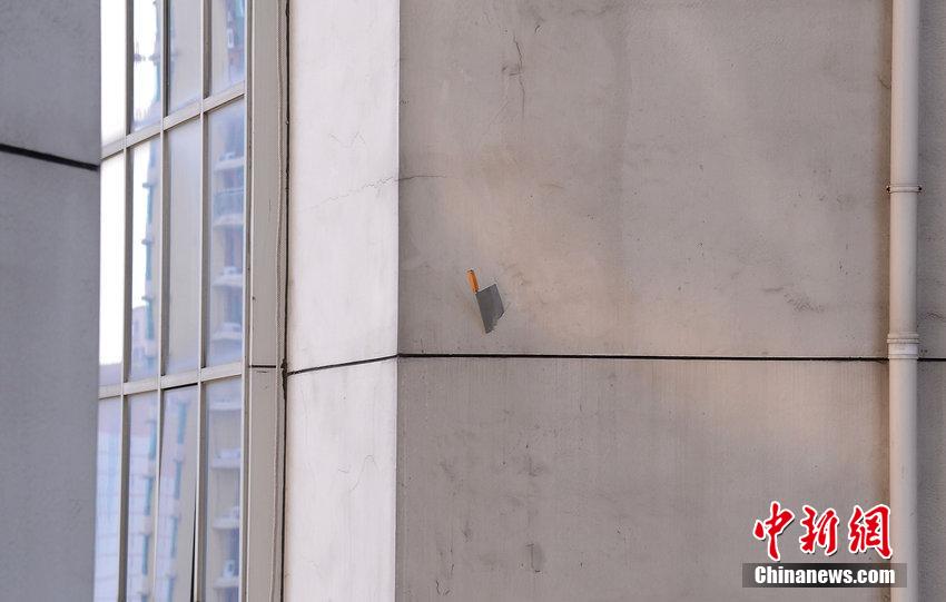 2014年8月14日,成都天盛壹中心B座,一把菜刀插入外墙,危及建筑物下路人安全。 图片来源:CFP视觉中国
