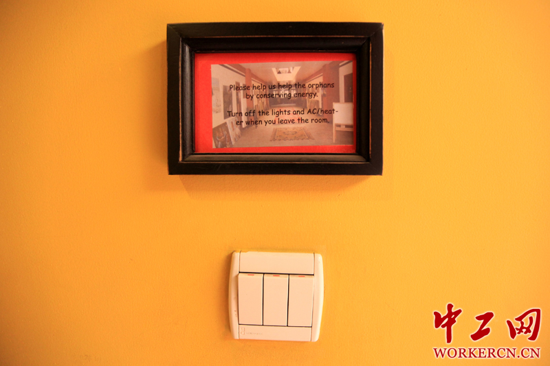 橘黄色的墙壁显得舒适而温馨,白色的电源开关上方,黑边相框内的英文不仅提醒人们节约用电,还呼吁帮助孩子们,传递正能力。