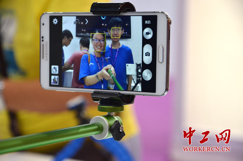 现场工作人员正在展示“自拍神器”的使用方法。 (中工网记者 笑语摄)