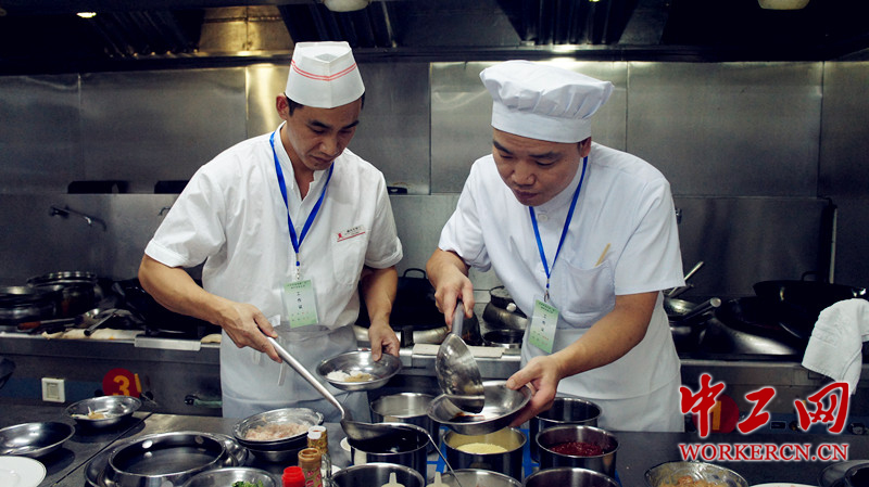 本次竞赛要求参赛选手在30分钟内完成宫保鸡丁、萝卜丝汆丸子两种制定菜品的切、配、烹炒。图为两名参加比赛的厨师正在调配菜汁。中工网记者 葛姗 摄