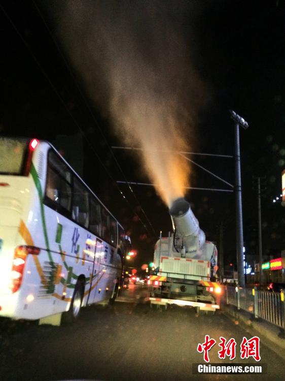 济南市近来再次名列全国70余城市空气质量榜之尾,据监测,污染物中,石油冶炼厂家排污、汽车尾气、建筑扬尘等成为罪魁祸首。为消除严重的空气污染,济南市历下区城管局今年6月18日购置两台降尘雾炮车,趁夜晚街上行人渐少,在城区巡游,向雾霾开炮。据介绍,这雾炮每使用一次,能立即降低沿街PM2.5污染物20%。图为记者21日晚在济南市区偶拍到正在开炮的雾炮。 中新社发 邱江波 摄