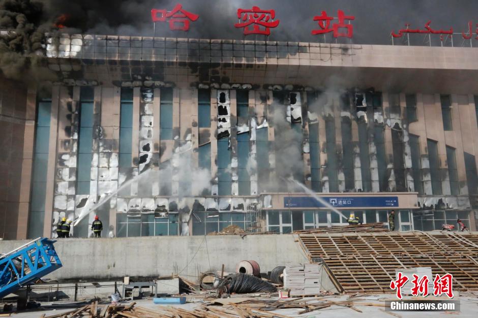 8月21日17时19分,新疆哈密消防支队119接警中心接到报警,由中铁12局承建的哈密市新火车站(在建施工工地)发生火灾,哈密消防支队立即调集7车35人前往火灾现场实施扑救。据悉,该火灾因施工单位作业过程中不慎引燃外墙保温材料引发火灾,过火面积约600平方米,未造成人员伤亡。当日18时40分火势已基本扑灭,目前事故损失正在调查核实中。中新社发 孙亭文 摄