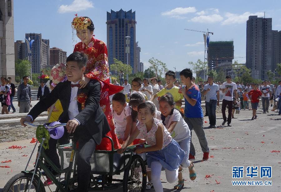 8月24日,在陕西榆林市高新区阳光城小区,新郎王镜程(左一)用三轮车喜迎新娘。当日,在地处陕北的榆林市高新区阳光城小区,居民王镜程、朱婧举办了一场传统婚礼,在秧歌队的陪衬下,新娘朱婧穿着传统服装手捧鲜花,新郎王镜程脚蹬着三轮车把新娘娶回家,隆重而简朴的婚礼洋溢着吉祥与喜庆。新华社发 张晋国 摄 图片来源:新华网