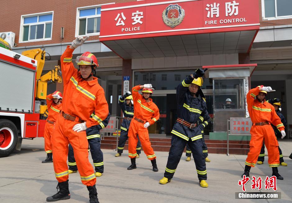 8月26日,消防官兵表演消防版的“小苹果”。河北省邯郸市公安消防支队的消防官兵利用休息时间,历经半个月,编排了邯郸消防版的“小苹果”。此版“小苹果”与其他版本不同,为让大家关注消防,共筑平安邯郸,消防官兵巧妙地将脍炙人口的“小苹果”歌词改编成了诙谐、幽默、朗朗上口的消防宣传语。 中新社发 郝群英 摄