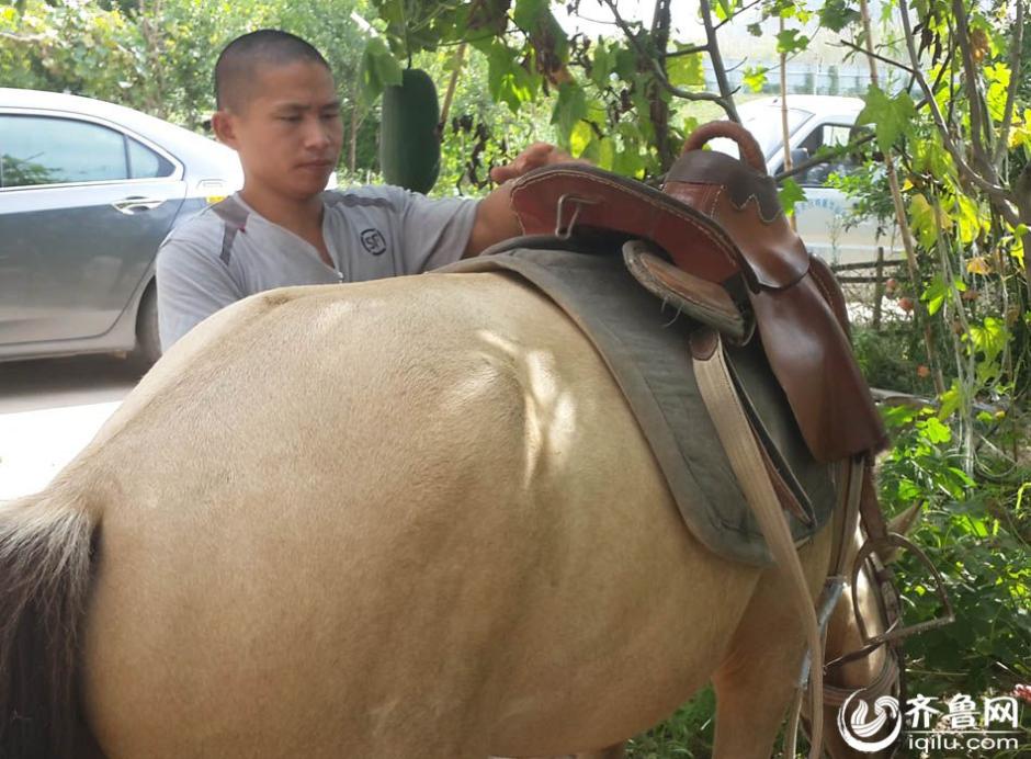 下班骑马回来后,史林为爱马解下马鞍。 齐鲁网实习记者 白少光 摄 图片来源:齐鲁网