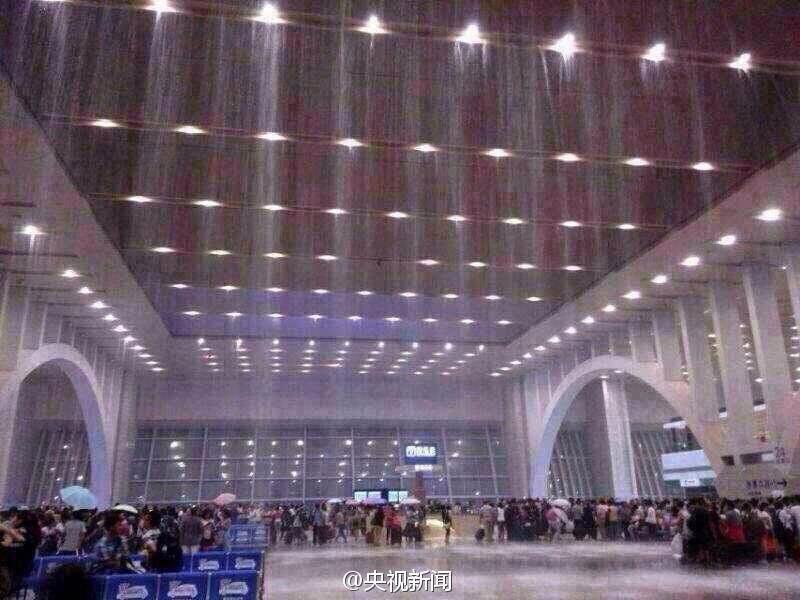 28日晚七点半,石家庄突然电闪雷鸣,狂风暴雨裹挟着冰雹倾泻而下。石家庄新修建的火车站,一下子变成“水帘洞”!半小时暴雨过后,雨势减弱,市区多条路段积水半米深,多辆车被淹,部分航班延误、列车晚点。图片来源:央视新闻微博