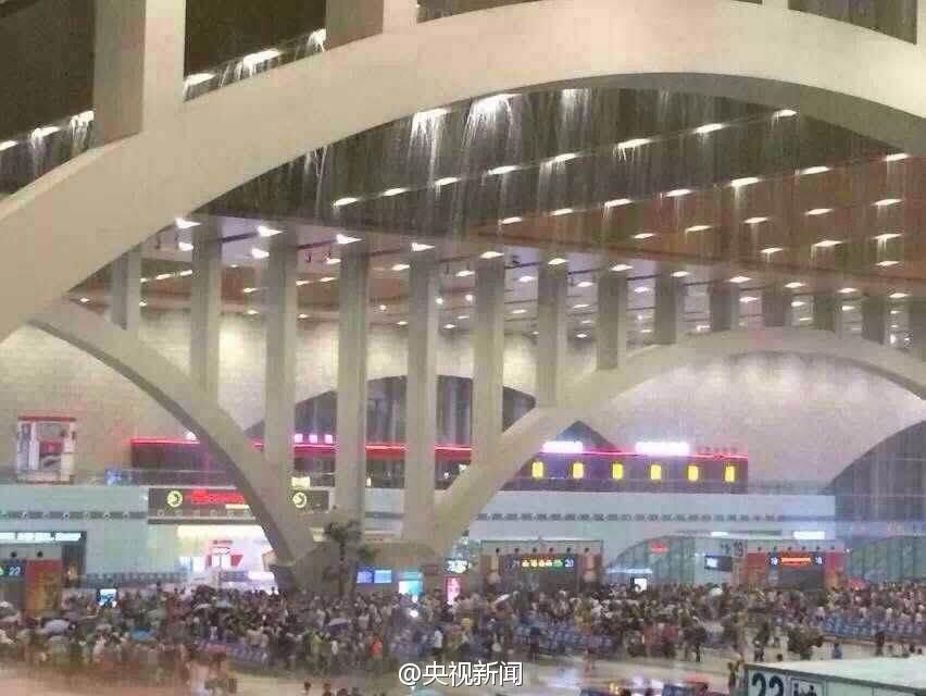28日晚七点半,石家庄突然电闪雷鸣,狂风暴雨裹挟着冰雹倾泻而下。石家庄新修建的火车站,一下子变成“水帘洞”!半小时暴雨过后,雨势减弱,市区多条路段积水半米深,多辆车被淹,部分航班延误、列车晚点。图片来源:央视新闻微博