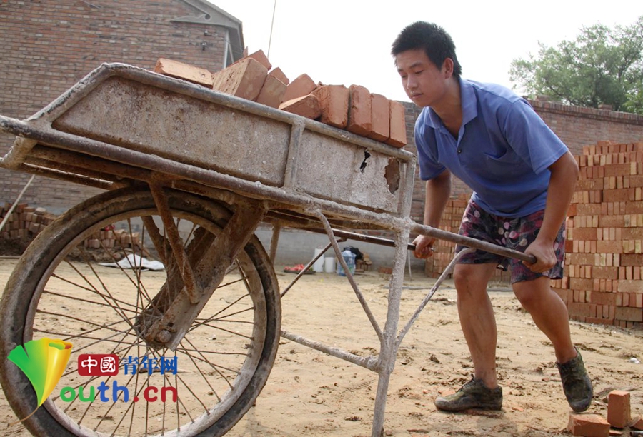 【河北沧县:贫困生连续4年建筑队干体力活赚学费】2010年7月23日,河北沧州,张恒在建筑工地搬运砖块。河北省沧县杜林乡张家营村的20岁的张恒今年高考取得了592分的成绩,被河海大学录取。因家贫他来到村里一个小建筑队当小工,这已是他连续4年靠干繁重的体力活赚取部分学费。