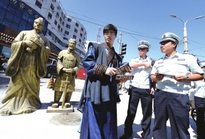 “秦始皇大战城管”上演现实版。昨天上午,在西城区白广路北口,“秦始皇”带着“大臣”、“妃子”和兵马俑出现在街头,向市民发放演出小广告时,被西城城管部门查获。