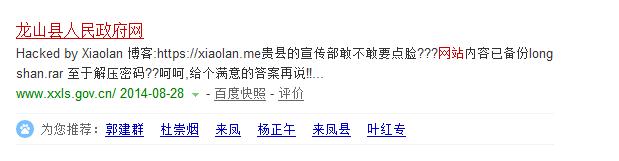 新京报记者今天中午发现,龙山县人民政府网无法直接访问,但可以通过百度快照浏览。通过百度快照发现,龙山县政府网已被黑客攻击,黑客留言“贵县的宣传部敢不敢要点脸”,并用大红宋体标出,结尾处连用5个问号。